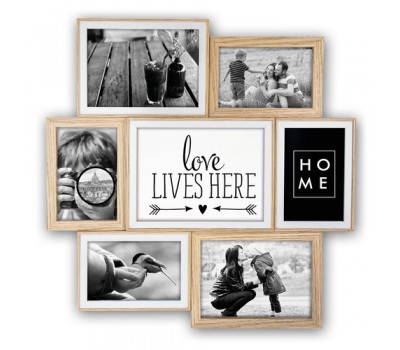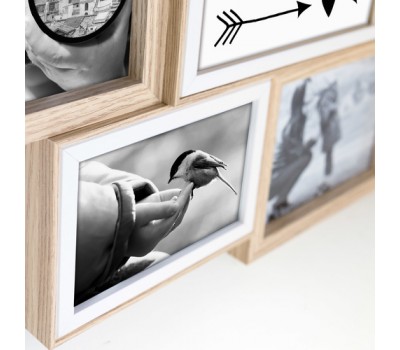 Watson wooden frame, brown color with white profile, wall-mounted multiple photo frame, composed by horizontal and vertical frames in different moldings and sizes, on overlapped levels, for 7 photos, suitable for home and office