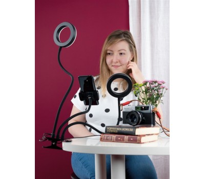 It couldn't be easier! With the table clamp, the LED selfie ring light is simply clamped to the edge of the table. The table clamp can be attached to table edges or other suitable objects with a max. width of 5,5 cm.