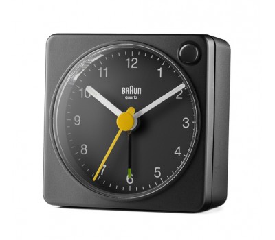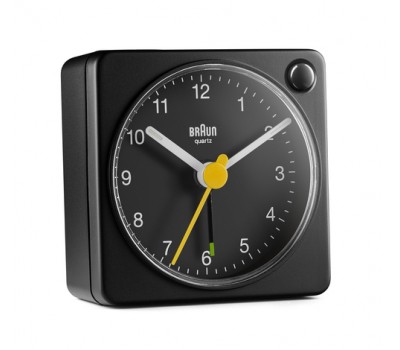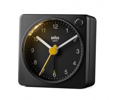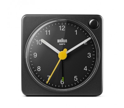 This Braun classic travel analogue alarm clock has an easy to read dial layout and features the iconic yellow second hand that is synonymous with Braun’s award winning design history. Its compact size (W5.7cm x H5.7cm x D2.7cm) and lightweight construction means it is the perfect travel companion. The iconic design of this Braun classic travel analogue alarm clock originates from the renowned AB 1, designed in the late 80’s by Dietrich Lubs. Recently, this clock has been updated to include an improved movement and luminous tipped hour and minute hands, as well a snooze/light function. The clean simplistic dial and contrasting hands (with luminous tips) offers great legibility, and the quartz tick movement is quiet and precise.