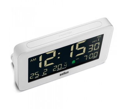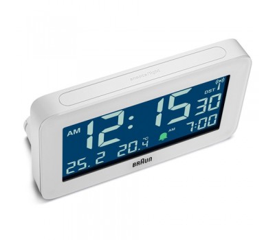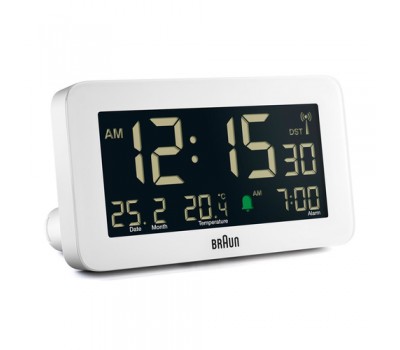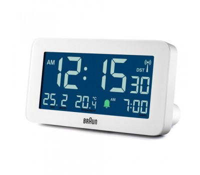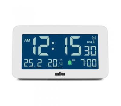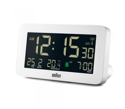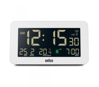 This Braun digital alarm clock features a negative LCD display with a backlight function that illuminates the display when in a low-light environment to maximise legibility at night. It features a DCF signal Radio Controlled function for Central European Time Zone, ensuring ultimate accuracy at all times. The BC10-DCF can be set to either 12 or 24 hour mode, and displays the time (with seconds), date and month, temperature and alarm time.