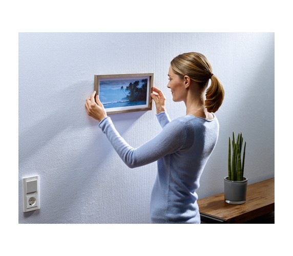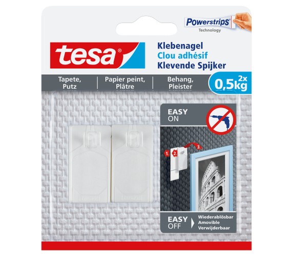 The tesa® Adhesive Nail for Wallpaper & Plaster and corresponding Adhesive Strips, included, are specially designed for easy mounting and a secure hold on textured and sensitive surfaces like wallpaper or plaster and hold up to 0.5 kg per nail. They offer a convenient way to hang pictures or decorations without damage, and the hassle associated with a hammer or drill. Thanks to Powerstrips® Technology, they’re super simple to use and are removable without a trace. Nothing is left but a clean and intact surface. You can even re-use the Adhesive Nail with a new Adhesive Strip.