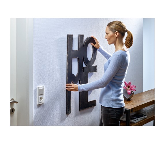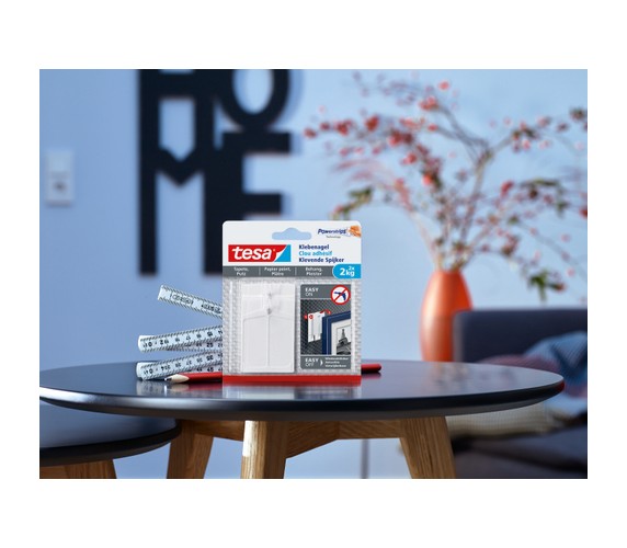 tesa® Adjustable Adhesive Nails for Wallpaper & Plaster 2 kg, along with two of the included Adhesive Strips for Wallpaper & Plaster 2 kg, make it easy to hang pictures or decorative objects in line. All without drills or hammers and with no damage to your surfaces. Each nail securely holds up to 2 kg with ease, and two of them can hold double that weight. Wall mounting on sensitive and textured surfaces has never been so simple.