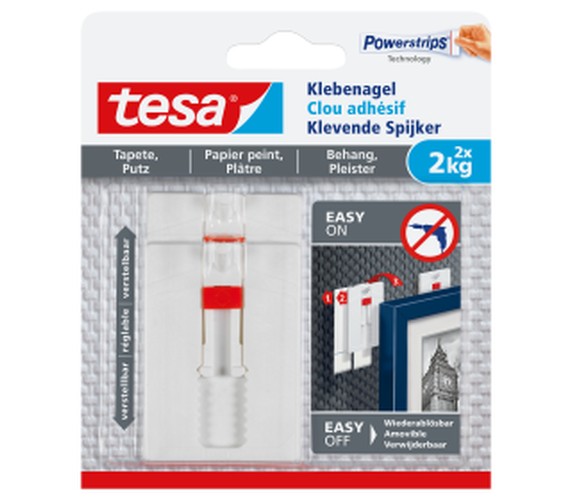 The tesa® Adjustable Adhesive Nail for Wallpaper & Plaster 2 kg provides a secure hold on textured and delicate surfaces. And you won’t even need any tools because everything you need to hang your object is inside the pack. Adjustable Adhesive Nails provide you with a smart, safe and easy way to hang pictures or decorative items. You can hang several pictures next to each other (or use two nails for one picture to double the holding power), because they’re adjustable you can be sure that everything you’re hanging is going to be perfectly aligned.