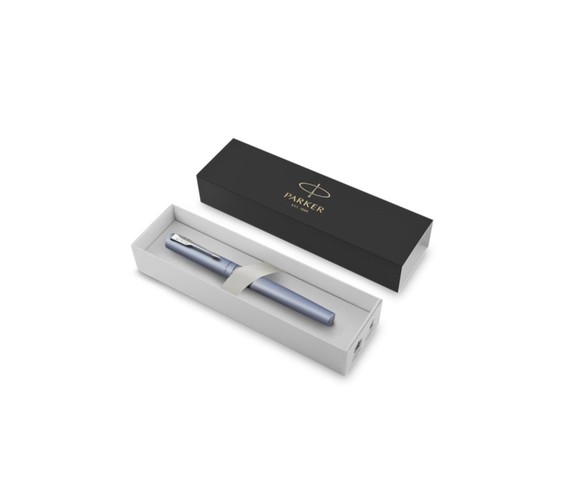 Stylish design meets reliable performance, Vector XL Rollerball Pen suits any modern lifestyle. The satin metallic silver-blue finish is complemented by chrome trims and the signature PARKER arrow clip. Featuring a unique transparent shell revealing the inner workings of the pen, it is finished by an incredibly smooth rollerball tip providing fluid, skip-free writing, to deliver a writing experience that is comfortable and consistent. Presented in a PARKER gift box, it is the perfect gift for students and young professionals looking for a modern and high-quality pen, benefitting from Parker’s expertise in fine writing.