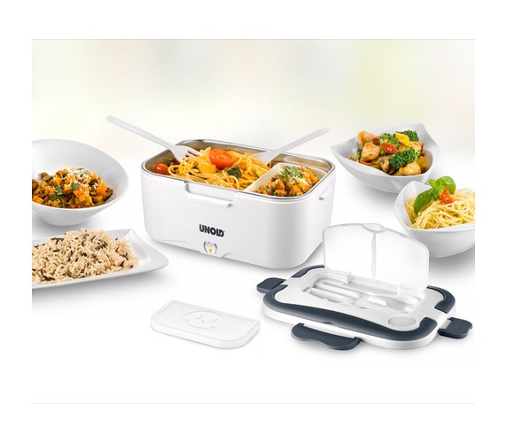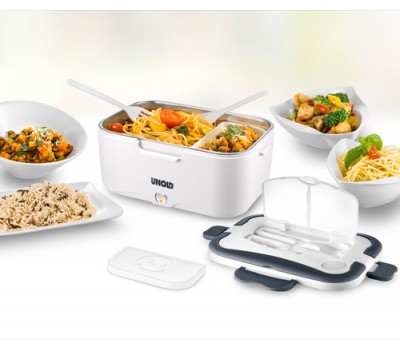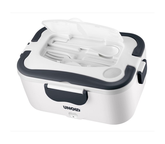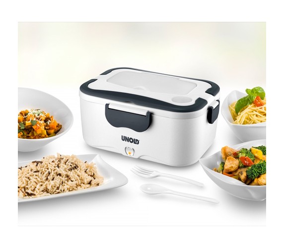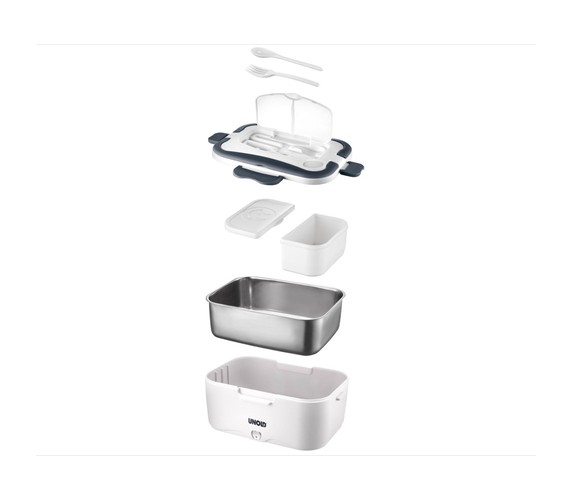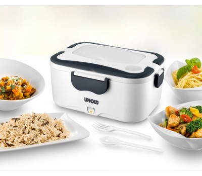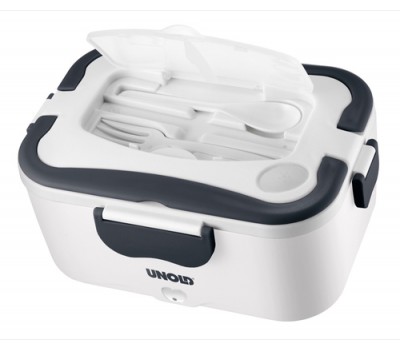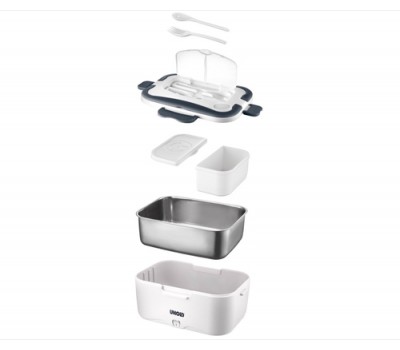 The electric LUNCHBOX is ideal for anyone who wants to eat a warm meal at work. The LUNCHBOX with a removable power cable contains a stainless steel container and a plastic container with a lid. With a capacity of 1.5 liters, it is large enough for one meal. The LUNCHBOX lid has space for a spoon and fork. When it is time to eat, connect the LUNCHBOX to the power supply - then everything is heated to a maximum of 70°C. The lid, the stainless steel container, the plastic container with lid and the cutlery are dishwasher safe.