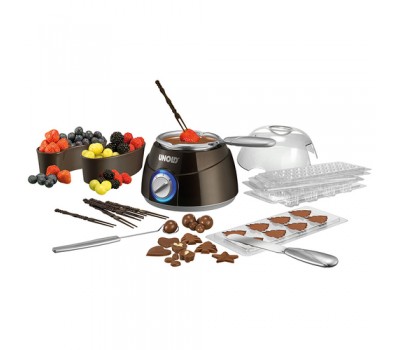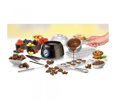 With the CHOCOLATIER, chocolate is melted at two temperatures: 85°C and 115°C. The 250 ml aluminum melting pot can be removed for easy pouring and cleaning. Extensive accessories are included: two plastic bowls for fruit and six skewers are perfect for chocolate fondue. The praline fork allows you to dip fine fillings into the liquid chocolate. Six different molds for motif bars, a spatula for easy removal and the operating instructions with recipes round off the sweet package!