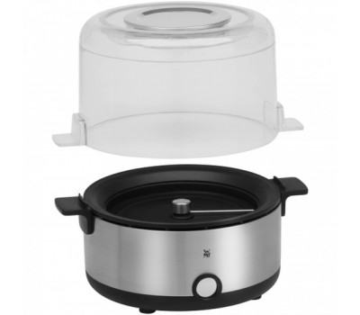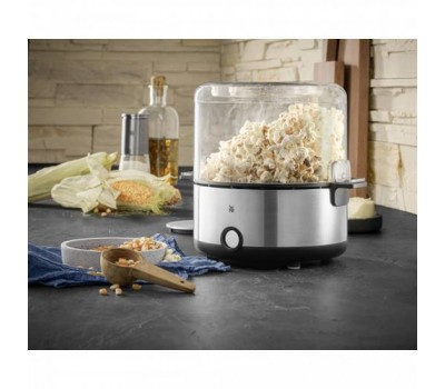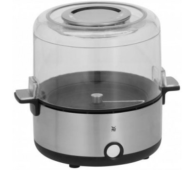 Finally! Home movie evenings for two with homemade crispy popcorn. Easy, fast and safe – the compact and powerful WMF KITCHENminis popcorn machine with up to 2.2 l filling quantity for unlimited popcorn pleasure in a matter of minutes. Lightning fast operation – the turning mechanism and non-stick coating ensure even, low-fat and aromatic preparation. Simply add the desired aromas through the filling hole in the lid, which also doubles up as a stylish serving bowl. Delightfully clean: no sticky fingers thanks to WMF Easy Handling. Simply turn the appliance upside down and pour the ready popcorn into the serving bowl. What’s more, the Cromargan® insert in the removable lid prevents butter or oil residues from landing on the table. Convenient bonus: The casing made of matt Cromargan® and the handle stay cool and can be touched during operation.