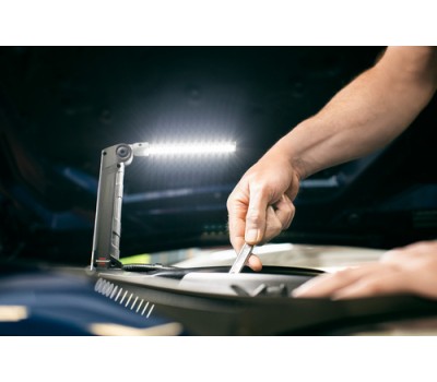 The cordless LED Torch SANSA 401 A is an extremely slim and narrow LED Work Light with 3.7V/2.0Ah Li-Ion battery and charging indicator. Thanks to the rubberised surface, the LED Inspection Light fits perfectly in the hand. With the integrated magnets and the fold-out hook, the Flash Light can be used flexibly and thus ensures hands-free working with full light output.
