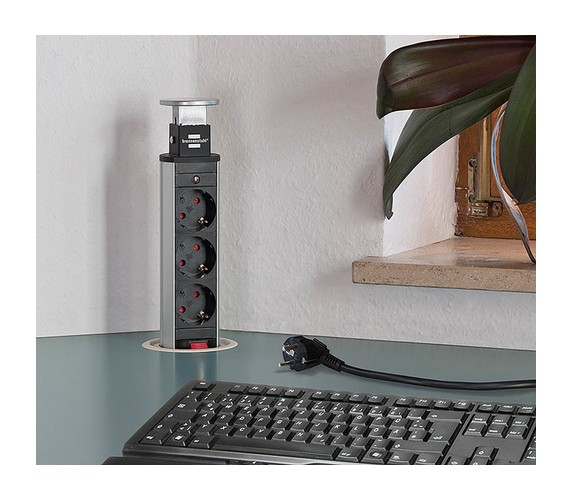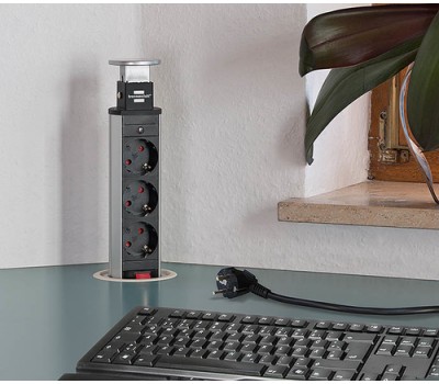 - Retractable desk outlet for permanent installation. Installs flush with the desktop. Suitable for office, kitchen, workshop, etc.