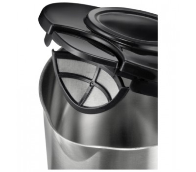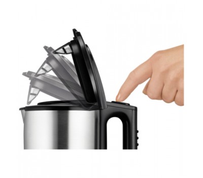 The covered heating element and the large opening of the water tank make cleaning easier. The lid of the water tank with integrated limescale filter opens at the touch of a button. Available with plastic elements in white, black or blue.