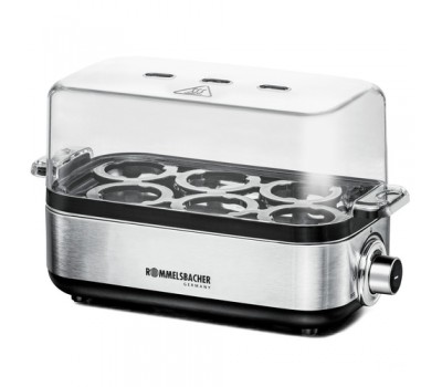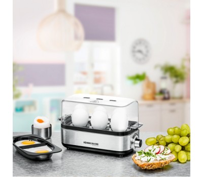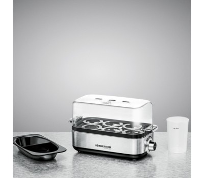 High-quality materials and an easy operating concept convince directly on the breakfast table. The cooking is time-controlled with always the same amount of water, so that you can quickly find the right setting for the preferred degree of hardness. From soft to hard, totally individual by using the practical rotary knob. The cooking time is monitored electronically and a signal tone sounds after expiration; then the finished eggs can be removed quickly and safely together with the egg tray, can be chilled and served. Also poached egg can be prepared in this appliance, in which you can cook two poached eggs at the same time. Thanks to the poaching insert, the appliance can also be used as a compact steam cooker. The integrated overheating protection, the easy-care heating bowl made of stainless steel, the measuring cup with egg piercer and the practical cord take-up are further plus points of this first-class kitchen helper.