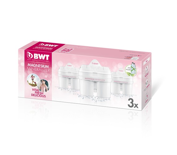 The innovative BWT Magnesium Mineralizer filter cartridges form the ‘core’ of BWT’s table water filter range and are exceptionally long-lasting. A single cartridge filters around 20 more litres than conventional systems, i.e. roughly 120 litres (with water hardness of 15–17.8° dH). This means 120 bottles of water you don’t have to carry around or 120 fewer plastic bottles to dispose of.