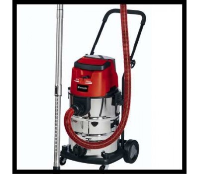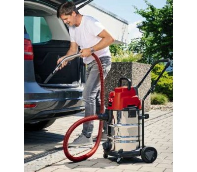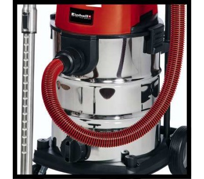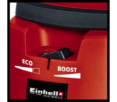 The Einhell TE-VC 36/30 Li S-Solo cordless wet and dry vacuum cleaner is an indispensable helper for vacuuming, drying and cleaning work in the home, basement, workshed or garage. The cordless wet and dry vacuum cleaner is a member of the highly efficient Power X-Change family and can therefore be used with total flexibility far away from the nearest socket outlet, and the high-performance and long-lasting rechargeable batteries make it the ideal helper every time even on difficult jobs. As members of the PXC family, all the rechargeable batteries from the complete system series can be used. Two speeds, ECO and BOOST, ensure that the battery is used to optimum effect. The stainless steel tank has a capacity of 30 liters and is rust-free and built for sturdiness. The blow connector is for blow-cleaning hard-to-reach areas such as corners, recesses and in-between spaces. Easy transportation is ensured by the large castors and wheels. Particularly practical is the holder for accessories to keep the accessories neatly stored and readily available for use when working. The cable holder is built into the housing. A water drain screw enables the water which has been suctioned up to be be discharged quickly and effortlessly. There is an air regulator on the handle. The telescopic tube is 36 mm long and is made of stainless steel. The product is supplied complete with a heavy-duty suction hose (Ø 36 mm, 2.5 m) and a large combination nozzle for carpets and smooth flooring. Thanks to the foam filter, pleated filters and paper dirt collector bag supplied with the product, nothing stands in the way of getting started straight away. This product comes without a battery and charger which are available separately, for example as a practical set.