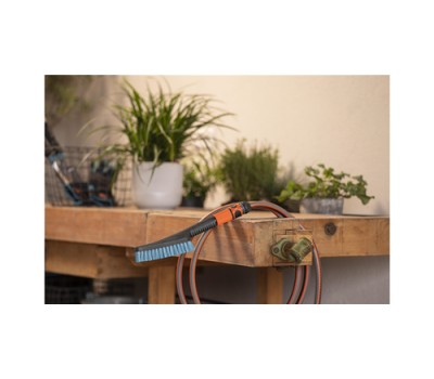 The non-slip handle enables safe and stable handling, while the hard bristles remove even stubborn dirt. The flat design ensures precise cleaning, even in hard-to-reach areas. With the hand-held scrubber, corners and edges are no longer a problem. Simply connect to the water hose with just one click for tough scrubbing of small, hard surfaces such as bins.