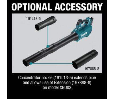 The Makita® Blower Nozzle allows for the use of an Extension or Flat Nozzle (both sold separately) with the Makita 18V LXT Cordless Blower (XBU03, sold separately). It installs quickly and easily for added user convenience. Each nozzle is manufactured of high-quality materials for added durability and long life. The extension nozzle (197888-8, sold separately) extends the pipe closer to the ground for improved operator comfort. The flat nozzle (197889-6) concentrates the air flow to remove heavy debris.