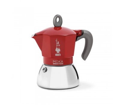 Induction mocha teapot Bialetti Moka Induction for 2 cups of coffee. The upper part is made of food grade aluminum with a red surface, the lower part is made of polished 18/10 stainless steel and with a black plastic heat-resistant handle.