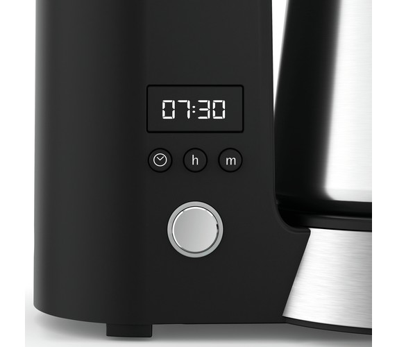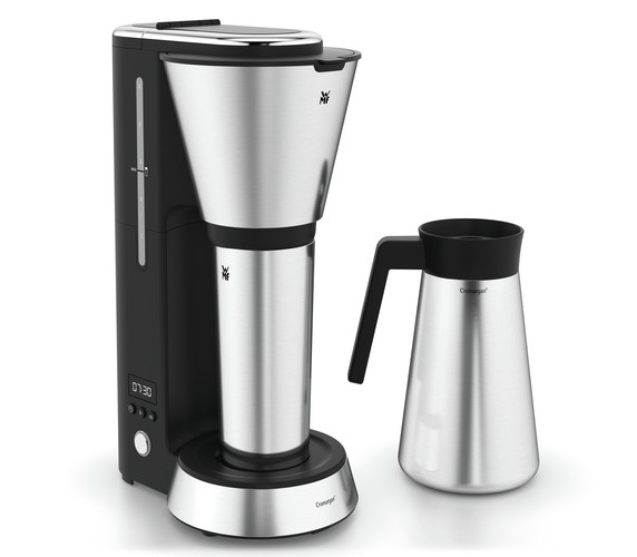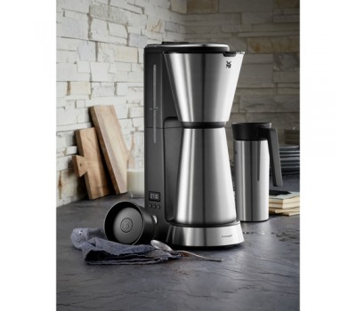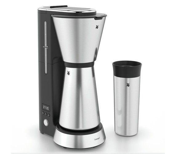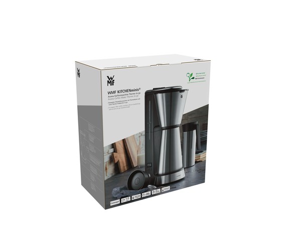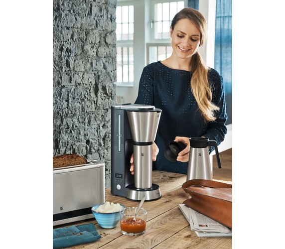 Enjoy hot coffee anywhere and any time. The space-saving filter coffee machine releases a wonderful coffee aroma first thing in the morning. With the 24-hour timer you can programme it for when you wake up. Whether with a cosy breakfast at home or for drinking on the way to the office: Simply place the thermal jug or the thermal "to-go" drinking cup under the brewing mechanism – and off you go. The two lids are leakproof and drip-free, and thanks to the WMF Keep Hot thermal insulation, your freshly-brewed hot coffee keeps its taste for hours. Drink with a clear conscience: Say goodbye to disposable coffee cups and use the thermal cup that is supplied.