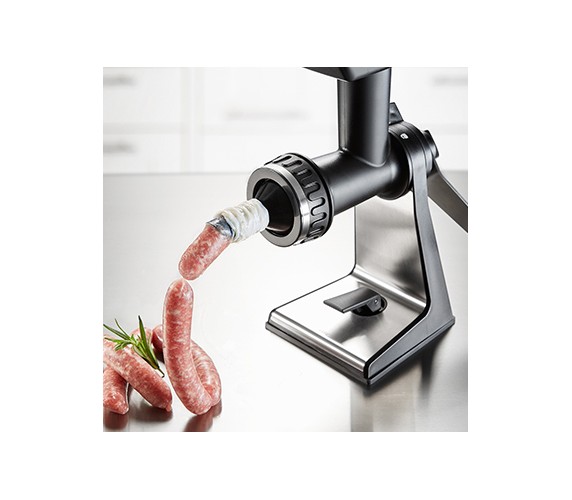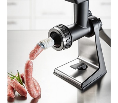 Using the multifunctional meat grinder, meat and veg is easy to grind with little effort. Sophisticated engineering, including the special design of the conveyor screw, the self-grinding knife or the interior thread ensures perfect results. The supplied sausage stuffer makes it easy to fill cannelloni as well, and the spritz biscuit attachment gives cookie dough the perfect shape. A safe stand is guaranteed by the suction foot or the table clamp which can be fixed to worktops up to 8 cm thick. The pusher ensures every last scrap of material is processed and serves to fasten and loosen the meat mincer’s lock nut.