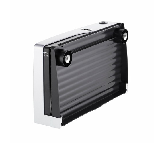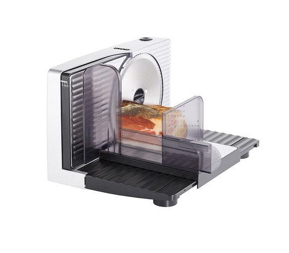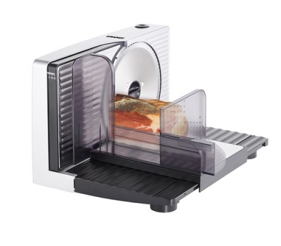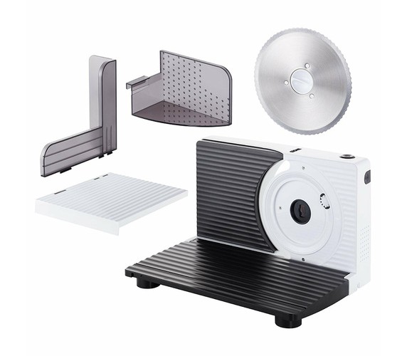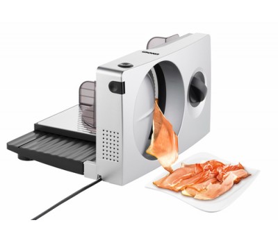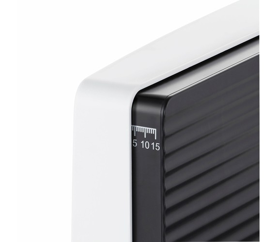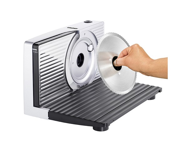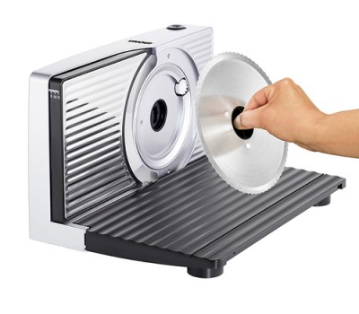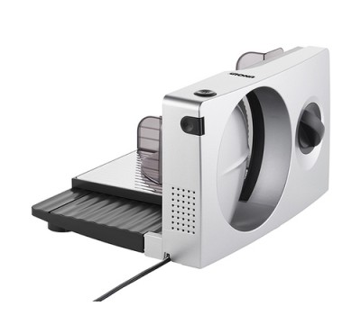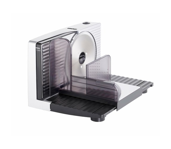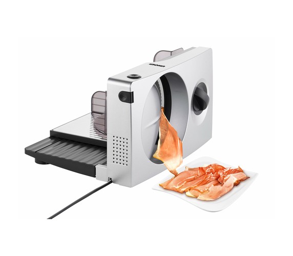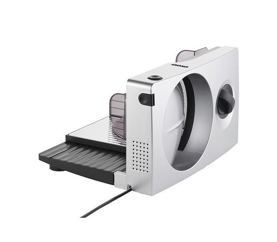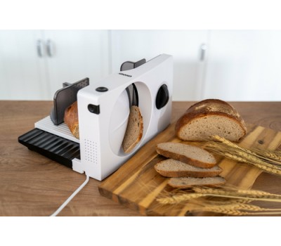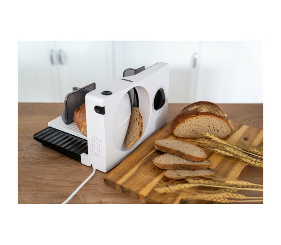 The BPA-free ALL-PURPOSE SLICER Curve White with its stainless steel serrated blade (approx. 17 centimeters in diameter) has a continuously adjustable cutting width and produces even slices of 0 to 15 millimeters. Food such as meat, cheese or bread can be processed without leaving any residue - thanks to the removable leftover holder with finger protection. Because it is foldable and has an integrated cable storage, the sharp kitchen assistant can be easily stored in the kitchen cupboard. Anti-slip feet and the safety switch with child lock are standard!