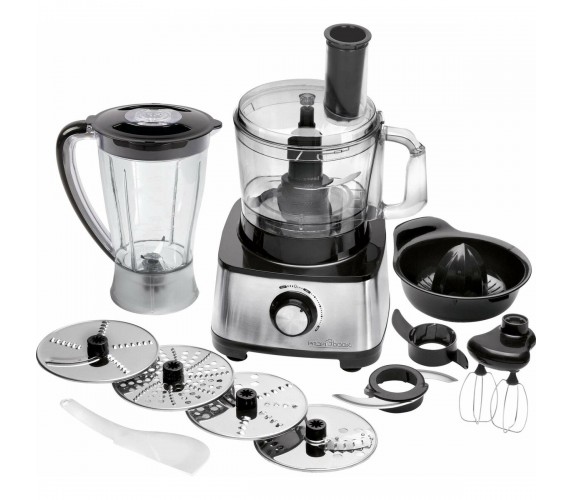 - 11 accessory parts: Citrus press insert, 2 x grating and cutting discs (fine & coarse), potato grating disc, chipping disc, guillotine blade, stainless steel dicing blade, special kneading/stirring attachment, stainless steel whisk, dough scraper