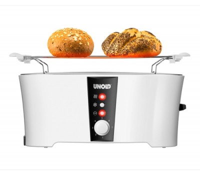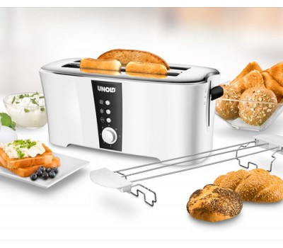 In the TOASTER Design Dual, four slices of bread can be toasted, defrosted or warmed up at the same time. The function indicator lights show what it is doing and there is of course a stop button. The degree of toasting can be adjusted continuously and consistent results are achieved by automatically centering the slices of bread, which can be easily removed using the lift function. The white, heat-insulated cool-touch housing houses a removable crumb tray and cable storage. The bun attachment is of course included!