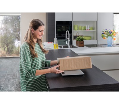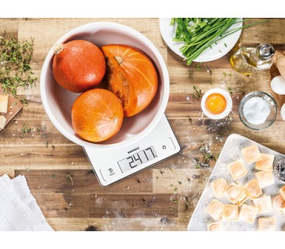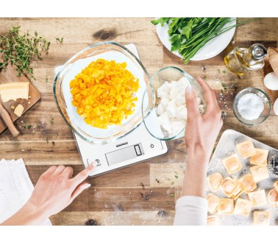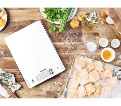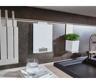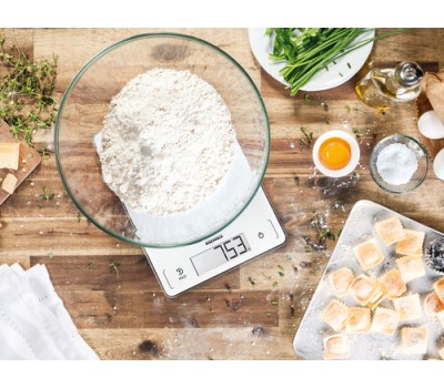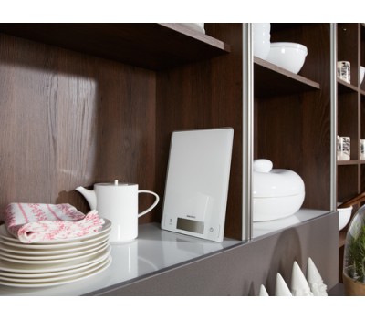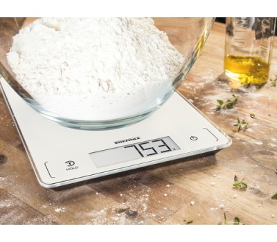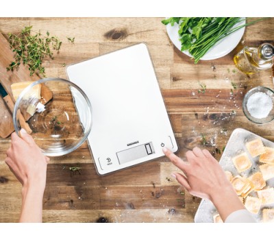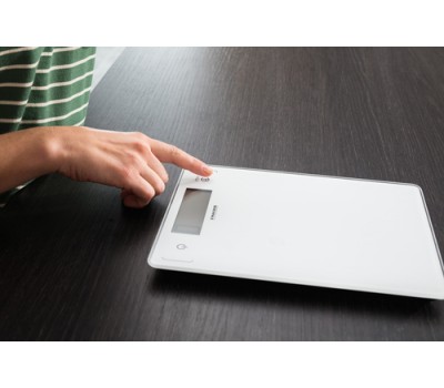 Complex recipes with a long list of ingredients pose no problem for this digital kitchen scale; its tare function means another ingredient can be added at any time. No matter what you’re weighing, the scale’s glass surface can be cleaned in an instant. Because its Sensor Touch fields are seamlessly integrated into the scale’s stylish front, no dirt gets stuck to it, everything stays clean and hygienic, and the scales retain their attractive, sophisticated appearance.