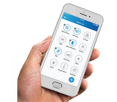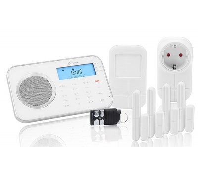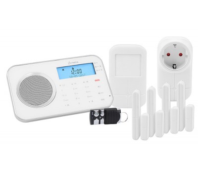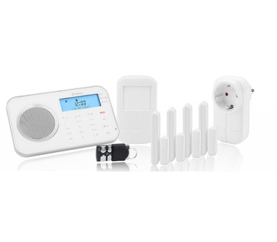 1 base unit, 1 remote control, 4 door-/window sensors, 1 PIR sensor, 1 smart plug, 1 power adapter plug, batteries, user manual, fixation material.