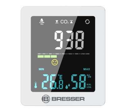 Endless meetings, urgent work emails, looking after the kids, cleaning the flat... during our hectic lifestyles, its easy to forget about regular ventilation. Even though we know better: a high CO2 concentration cam affect our health and wellbeing. The BRESSER CO2 air quality monitor Smile will show you when its time to let some fresh air into your home or office. Simply take a quick look at the intuitive LED display to keep an eye on the CO2 concentration, temperature and humidity. You dont need to worry about remembering what constitutes a critical carbon dioxide level - the intuitive graphical display with a linear scale and smiley face will show you the quality of the air in your surroundings. The measurements are precise, with high resolution and fast.