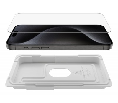 - ScreenForce UltraGlass 2 Treated Screen Protector for iPhone 15 Easy Align tray Dust removal sticker Cleaning cloth
