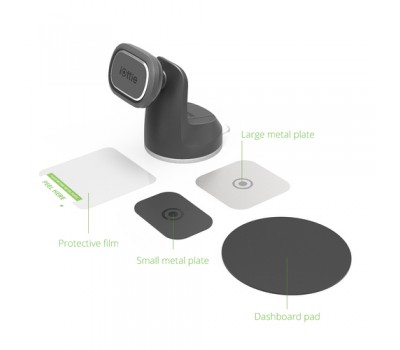 The Tap Magnetic 2 dashboard and windshield mount is a sleek and powerful magnetic mounting solution that holds smartphones in any vehicle. Designed for maximum convenience, the iTap 2 features two rare-earth magnets that provide a strong hold for all smartphones and case combinations. A Metal Plate Kit includes small and large metal plates and a Protective Film that attaches directly on the back of the smartphone or case, and does not interfere with wireless charging when positioned accordingly. Install iTap Magnetic 2 on textured or smooth vehicle dashboards with a super strong Suction Cup and a Dashboard Pad that secures the mount in place. Once installed, simply tap the smartphone on the Magnetic Mounting Head to hold the device while driving. Adjust viewing angles in seconds with a rotating ball joint that swivels for added convenience. The iTap Magnetic 2 dashboard and windshield mount from iOttie is compact and powerful to safely enhance the driving experience on the road.