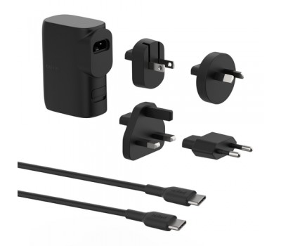 The charger is ready to go with interchangeable plug types needed for international travel included.