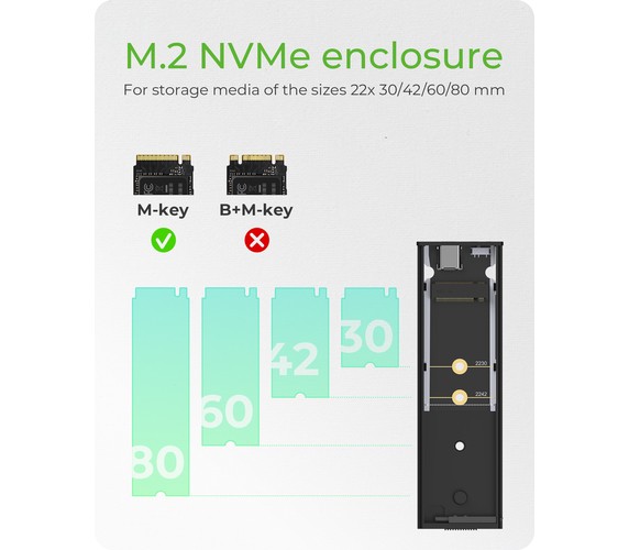 The IB-1807MT-C31 is an external enclosure for M.2 NVMe SSDs. Your storage medium will find a safe place in the robust housing made of high-quality aluminium - without the use of tools. The aluminium also ensures optimal cooling of the SSD. USB 3.2 (Gen 2) ensures fast data transfer at up to 10 Gbit/s. The matching USB Type-C cable with Type-A adapter is supplied in the scope of delivery. The high-quality aluminium housing accommodates SSDs in all common M.2 form factors: from 2230 to 2242 and 2260 to 2280.