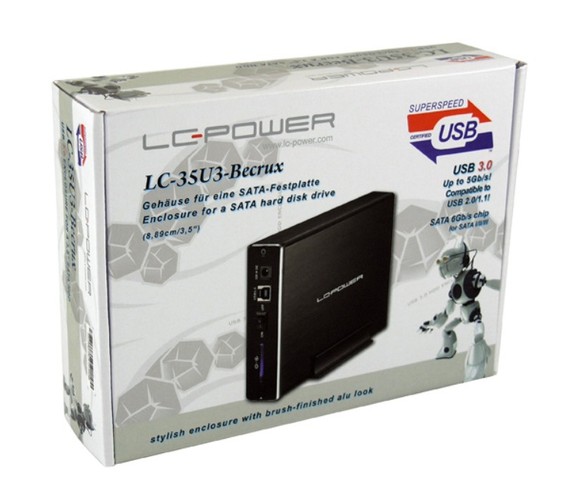 First class external enclosure for 8,89cm/3.5" SATA hard disk drives with aluminium body for an excellent heat dissipation. Stylish modern design, USB 3.0 connector for a superspeed data transfer rate.