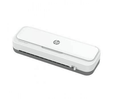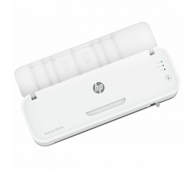 The HP OneLam 400 A4 is a compact laminator for versatile use in the hobby sector and home office and fits neatly on any desk. This modern laminator is suitable for both hot and cold lamination and seals your documents from business cards up to A4 format. An intuitive function button is used to set the required temperature based on the film thickness and this modern assistant is ready for use in 2-4 minutes. A cutting ruler, corner scraper and a 15-piece starter set consisting of three A4, four A5, four A6 and four business card sheets is supplied so that you can begin your laminating pleasure right away. The cutting ruler can be stored in a handy compartment underneath the device so that you always have the accessories at hand.