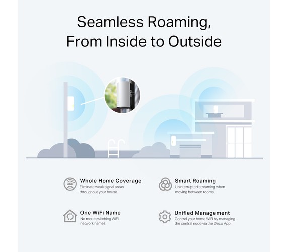 Deco X50-Outdoor features a weatherproof enclosure and solid operating temperature, enabling strong Wi-Fi signals outside. Flexible installation and power supply make it even easier for outdoor use.