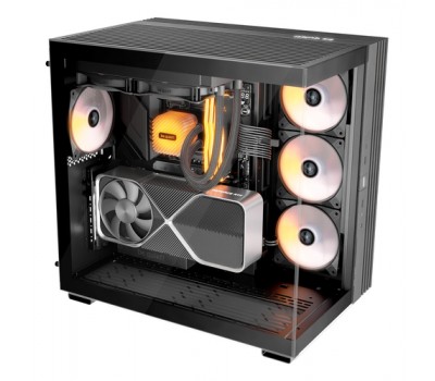 Light Base 600 DX Black features no preinstalled fans. However, up to 10 fans can be installed in total, making Light Base 600 DX Black extremely versatile. With its spacious design, it can hold up two 360mm radiators simultaneously, an ATX motherboard and even the most powerful graphics cards. Thanks to the dual chamber design, drives and cables are neatly tucked in the back and do not get in the way of airflow.