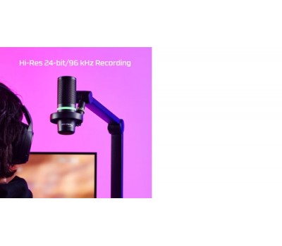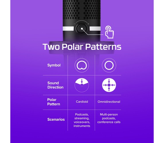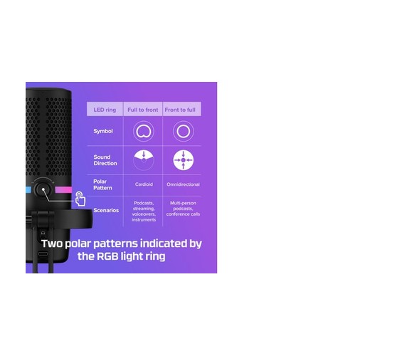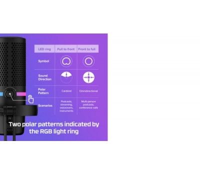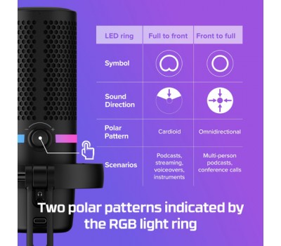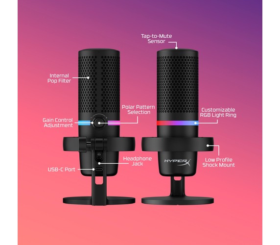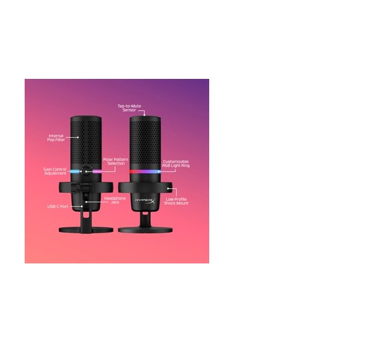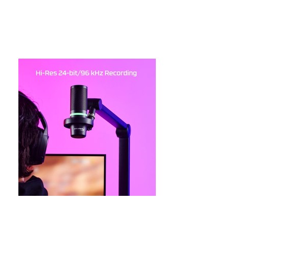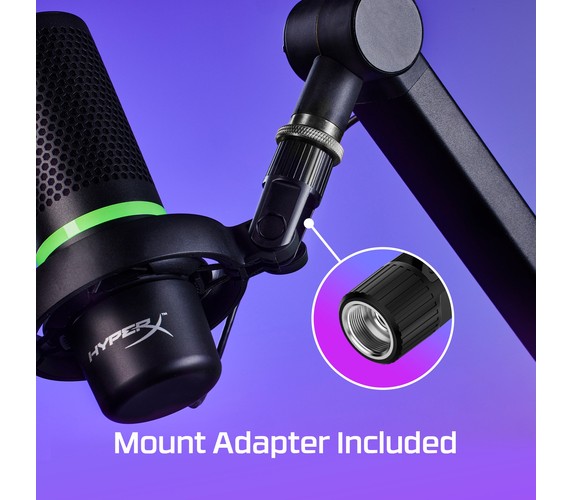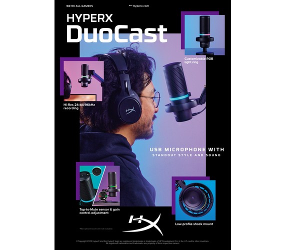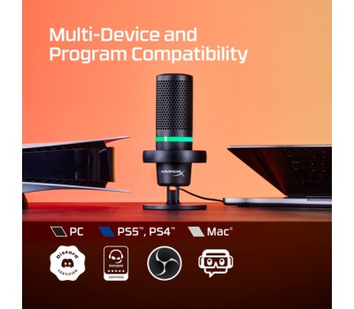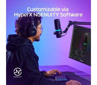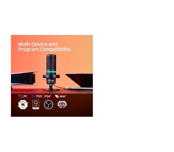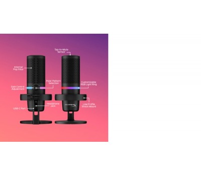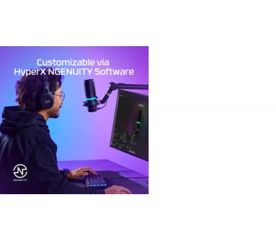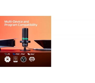 Featuring an elegant design, a low-profile shock mount, and a tasteful RGB light ring, the HyperX DuoCast is a full-featured USB microphone that’s built for gaming, working, and content creation. It shares the fan-favorite features of its HyperX mic siblings, such as tap-to-mute, and the vibrant LED mic mute indicator, but also brings its own unique, subtle style. A lowprofile shock mount complements the sleek, minimalist aesthetic, while also absorbing vibrations, and taking up less space. An included mount adapter allows for compability with most mounts and the versatile DuoCast is also compatible with PC, PS5™, PS4™, and Mac®. Use HyperX NGENUITY Software and customize the RGB light ring to broadcast your own signature style.
