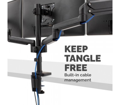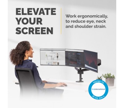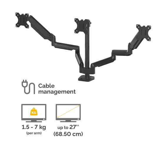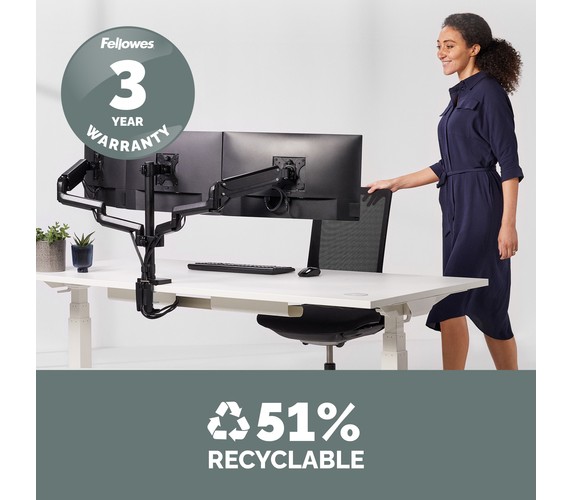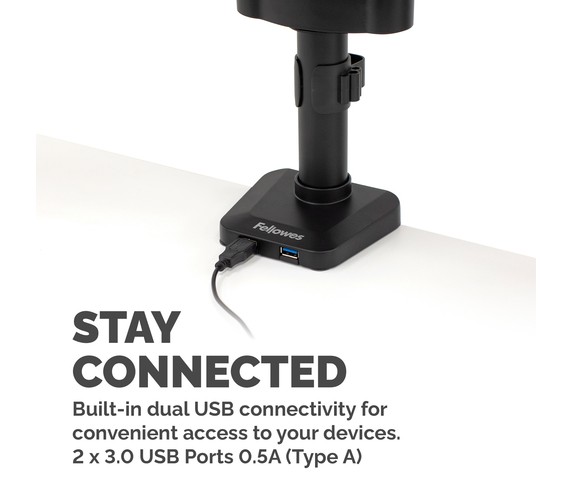 Sitting or standing with bad posture all day using a computer is bad for your health. Leaning forwards or tilting your head up or down not only causes back and neck strain but is also bad for your eyes. The Fellowes Platinum Series triple monitor stand will improve your ergonomic posture and reduce back neck and eye strain. Triple screen working means you can view more screen content and can use multiple programs simultaneously. With ever shrinking office spaces, using an adjustable monitor stand means you can free up valuable work space to become more organised and productive. With effortless adjustment you can collaborate and share information with colleagues easily, making them ideal for hot desks or shared desks. This fully independent adjustable monitor stand by Fellowes can pan 180 Degree, tilt +/-45° (90°) and can rotate 360° via gas spring technology allowing for effortless movement. Built in dual USB connectivity and intuitive cable management allows you to stay connected and minimise clutter at the same time with the Fellowes Platinum Series triple monitor mount. Easily mounted via clamp or grommet, each arm holds a monitor up to 7kg (up to 27-Inch monitors) and meets VESA monitor standards.