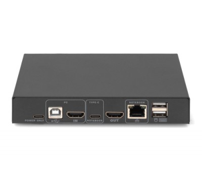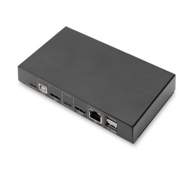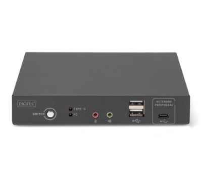 The DIGITUS® 2-port KVM switch with USB-C™ and network connectivity gives you the ability to control two 4K-capable PCs from a single USB keyboard and mouse. Conveniently switch between the two PCs at the touch of a button, eliminating the need to reconnect all cables. The Gigabit network port provides convenient access to the network via the additional USB-C™ port. The output to a monitor is done via the integrated HDMI output. Audio signals from the microphone and speakers can also be switched. In addition, another USB-C™ port and two USB A (2.0) ports are available on the front, which can be used for further peripherals such as USB sticks or external hard drives. Status LEDs on the front of the switch show you the current status at all times. The slim switch is rounded off by the robust metal housing.
