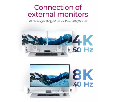 The IB-HUB801-TB4 supports up to two 4K displays at 60 Hz in extended or mirrored mode, a single 8K display at 30 Hz or a 5K Thunderbolt™ display at 60 Hz. When external high-speed storage is connected, you get read speeds of up to 3000 MB/s.