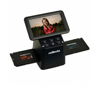 The reflecta x33-Scan can even digitize large quantities of slides and negatives in a simple but high-quality way. A CMOS sensor with 15.3 megapixels, together with reflecta’s Image Enhancement Technology IET, ensures the highest image quality and brilliant color reproduction. The scanner has a 5 inch IPS display with a wide viewing angle, which makes selecting, scanning and playing back the images a real pleasure. The x33-Scan digitizes an image in less than two seconds and saves it directly as JPEG files to an SD card. As a stand-alone device, it is completely independent of computers. The enclosed holders enable the scanning of mounted slides with a thickness of up to 3.2 mm as well as 35mm film strips with up to six frames.