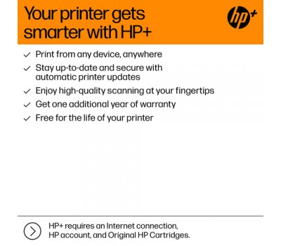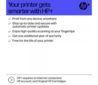 This is an HP+ enabled printer. Choose HP+ at product setup to activate benefits. HP+ requires an HP account, ongoing connection to the internet, and exclusive use of Original HP Ink cartridges for the life of the printer. More at: http://www.hp.com/plus
