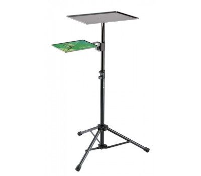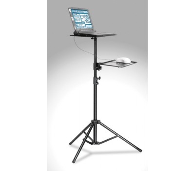 Height adjustable tripod with ergonomic clamping elements. The laptop rest plate can be easily attached to the bottom part by a prismatic connection. Includes a clampable mouse rest.