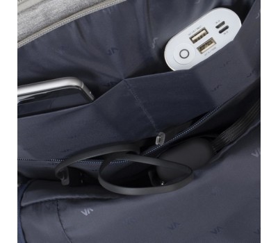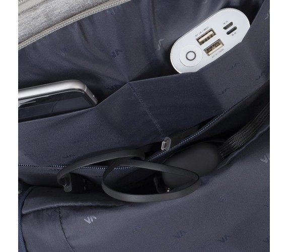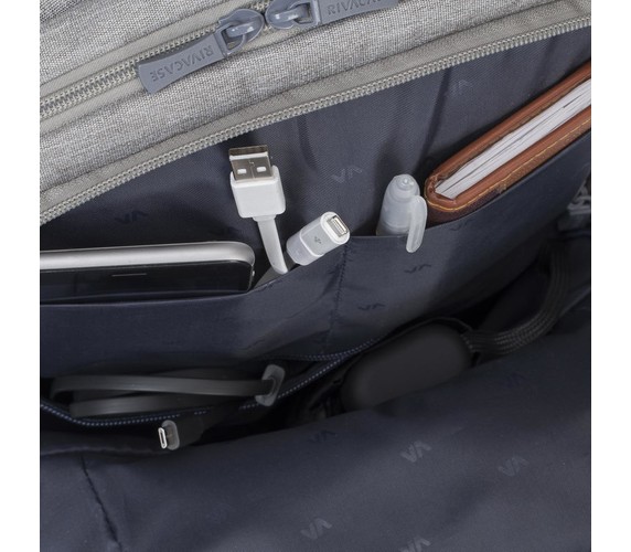 - Front storage zippered compartment holds an organization panel with slots for business cards, pens, MP3 player, smartphone and USB cables.